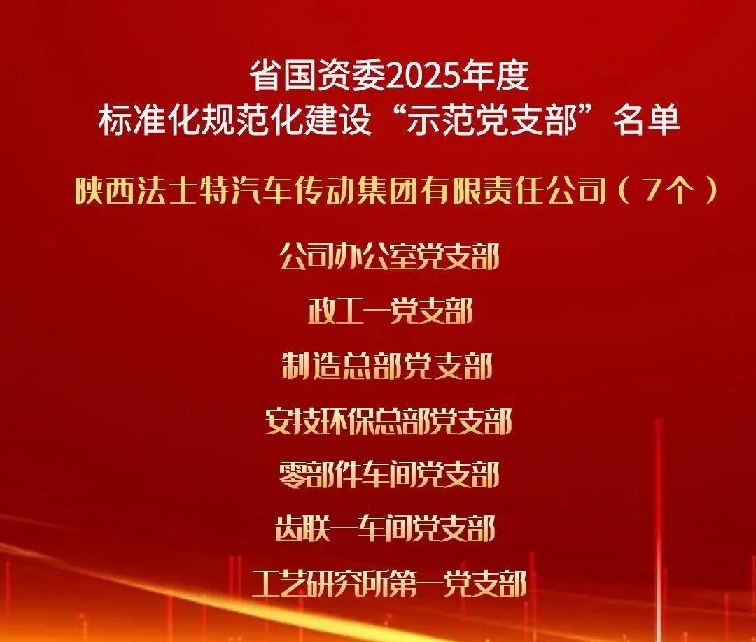 點擊量:1918近日,陜西省國資委黨委通報2025年度標準化規范化建設示范黨支部名單,法士特集團公司辦公室、政工一、制造總部等7個基層黨支部榜上有名,榮獲省國資委“示范黨支部”稱號。這既是對法士特集團黨委深耕黨建品牌建設、推進基層黨組織標準化規范化建設成果的高度肯定,更彰顯了企業以制度落實強化組織效能、推進黨建與業務深度...